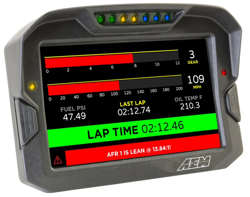 CD-7 Carbon Digital Dash Displays feature a full-color, daylight readable screen surrounded by a tough, lightweight flow-molded carbon fiber composite housing. Seven ultra-bright LEDs span the top of the display housing for RPM and shift light indication. Users can program them to ascend in specific increments based on RPM range and flash when it is time to shift. Brightness is user programmable on the fixed color LEDs. Two large buttons are included on the face of the display, allowing easy page changing and memory resetting even with driving gloves on. These button functions are included in the supplied rear connector, allowing the user to mount remote buttons. Two additional programmable LEDs are located above the toggle buttons on the top of the housing on either side of the integrated LED shift lights.