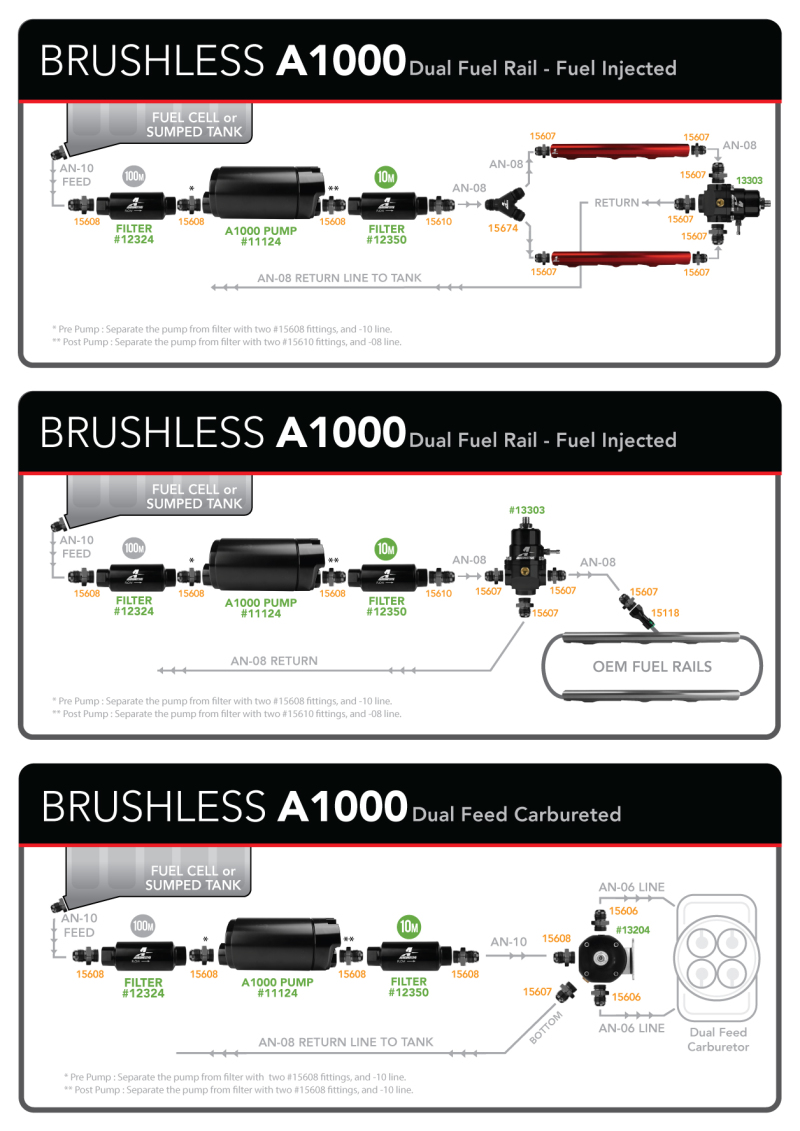 The market leader in fuel delivery systems and components, Aeromotive introduces its first brushless fuel pump series. The same A1000 Fuel Pump the world has come to trust and depend on, now available with the latest brushless-motor technology. Built for up to 65 psi of sustained pressure, featuring our bedrock solid roller vane design that primes easily, reduces friction and improves efficiency. ORB-10 inlet and outlet ports. For EFI applications use regulator P/N 13303 or P/N 13139. For carbureted applications use regulator P/N 13204 or P/N 13304. Perfect for ?blow-through? carbureted engines up to 1200 FWHP. Brushless motors employ sensors to monitor rotor angle to provide faster and more reliable phase shifting, producing more torque capacity and motor efficiency. Instead of the armature rotating, in a brushless motor the magnets rotate around the armature and the motor controller manages the phase shift to keep the motor rotating under load (load is related to pressure in a fuel pump).? With more torque per watt and a higher torque to weight ratio, brushless motors produce lower noise and deliver higher reliability. With a higher level of efficiency, down to fractions of a second in design speed control, the new Aeromotive brushless fuel pumps provide precise control of fuel pump RPM as pressure rises, better maintaining pump RPM and flow, producing a flatter flow curve.? Tight tolerances result in less current draw, less heat and extended life. Now there is the ability to upgrade to a premium brushless pump for faster, more reliable and uninterrupted fuel delivery with less power consumption and potential for wear or failure.