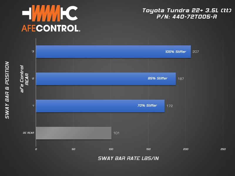 Dramatically reduce body roll without sacrificing ride quality with the aFe CONTROL Tundra rear sway bar. Our 3-way adjustable sway bar will allow you to easily dial in the handling balance of your Tundra. Sharpened steering response will improve initial turn-in making your Tundra feel lighter and more agile. The added stability and control are also welcome when hauling heavy loads in your truck bed or towing. Whether you’re on a road trip with the family or canyon carving in the mountains, aFe CONTROL will get you there. Every aFe CONTROL sway bar is CAD designed and CNC bent to strict tolerances. This insures precise fit and perfect operation.Our rear sway bar is 3-way adjustable. This allows the driver to dial in the rear roll resistance to achieve the desired handling bias. The rear sway bar utilizes laser cut end plates. These are robotically welded to the bar in a dedicated fixture to insure accurate hole positioning and consistent manufacturing. aFe CONTROL includes low-deflection polyurethane bushings and premium 6061-T6 aluminum black anodized billet brackets which are equipped with grease fittings for easy maintenance.