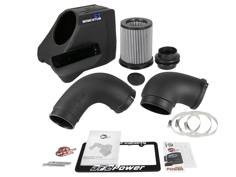Unique One-Piece Sealed Housing: The smooth one-piece sealed housing with auxiliary air scoop is used to eliminate the use of multiple-piece housings and ensure the coldest air intake charge available. A urethane plug is also included if you wish to completely seal the auxiliary air scoop. High Quality Tube: This system uses a high quality plastic CAD designed, dyno-tuned, roto-molded intake tube to achieve maximum power gains while maintaining a perfect fit. Large 3-Layer Performance Air Filter: This Momentum ST intake system was designed around the largest filter possible to allow maximum performance and filtration. This cone filter has a massive round flange and is 8" tall Pro DRY S filter media. The Pro DRY S performance air filter features 3-layers of progressive finer porosity synthetic media providing maximum convenience with 100% polyurethane frame for long life and multiple cleaning cycles. Premium Hardware: Premium stainless steel clamps and a silicone coupler at the throttle body is used for strength and durability whi le also providing the most secure installation available. Momentum ST intakes are designed with fewer parts for a quick and simple installation.