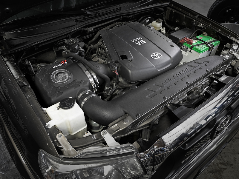 Bringing you the next generation of intakes, aFe is proud to introduce the Momentum GT Sealed intake system for the 2012-2015 Toyota Tacoma with the V6-4.0L engine. The Momentum GT sealed air intake system is designed using the most up-to-date engineering tools and techniques to provide you with the perfect blend of power and protection. This system is superior in every way. From the one-piece sealed housing, to the massive air filter, rotomolded tube and premium hardware. Unique One-Piece Housing: The smooth one-piece sealed housing with auxiliary air scoop is used to eliminate the use of multiple-piece housings and ensure the coolest air intake charge available. A urethane plug is also included for those cold weather applications where you want to block the auxiliary air scoop. Roto-molded Tube: This System uses a CAD designed, dyno-tuned, roto-molded intake tube to achieve maximum power gains while maintaining a perfect fit. Large 3-Layer Performance Air Filter: This Momentum GT intake system was designed around the largest filter possible to allow maximum performance and filtration. This cone inverted top filter has a massive round flange and is 8" tall inverted top Pro DRY S media. The Pro DRY S performance air filter features 3-layers of progressive finer porosity synthetic media providing maximum convenience. The unique air filter to housing interface (patent pending) allows for maximum filter size which increases the available air volume while simplifying the installation process. Premium Hardware: Premium stainless steel T-bolt clamps are used to securely mount the high flow air filter to the 1-piece airbox. Momentum GT intakes are designed with fewer parts for a quick and simple installation.