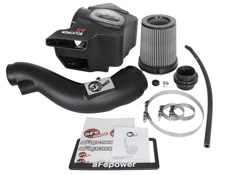 Unique One-Piece Housing: The smooth one-piece sealed housing with auxiliary air scoop is used to eliminate the use of multiple-piece housings and ensure the coolest air intake charge available. A urethane plug is also included for those cold weather applications where you want to block the auxiliary air scoop. A large, clear sight window is used for a hassle-free filter inspection and an aggressive style. (US PAT 9440175) For Filter-to-Housing Interface. Roto-mold Tube: This System uses a two piece CAD designed, dyno-tuned, roto-mold intake tube to achieve maximum power gains while maintaining a perfect fit. Huge 3-Layer Performance Air Filter: The Momentum GT is designed around an oil-free, large 8" Tall round inverted top 360 degree radial flow performance air filter with 3-layers of progressive finer porosity synthetic media providing maximum convenience. The unique air filter to housing interface (patent pending) allows for maximum filter size which increases the available air volume while simplifying the installation process. Premium Hardware: Premium stainless steel T-bolt clamps and a urethane hump coupler are used for strength and durability while also providing the most secure installation available. Momentum GT intakes are designed with fewer parts for a quick and simple installation.