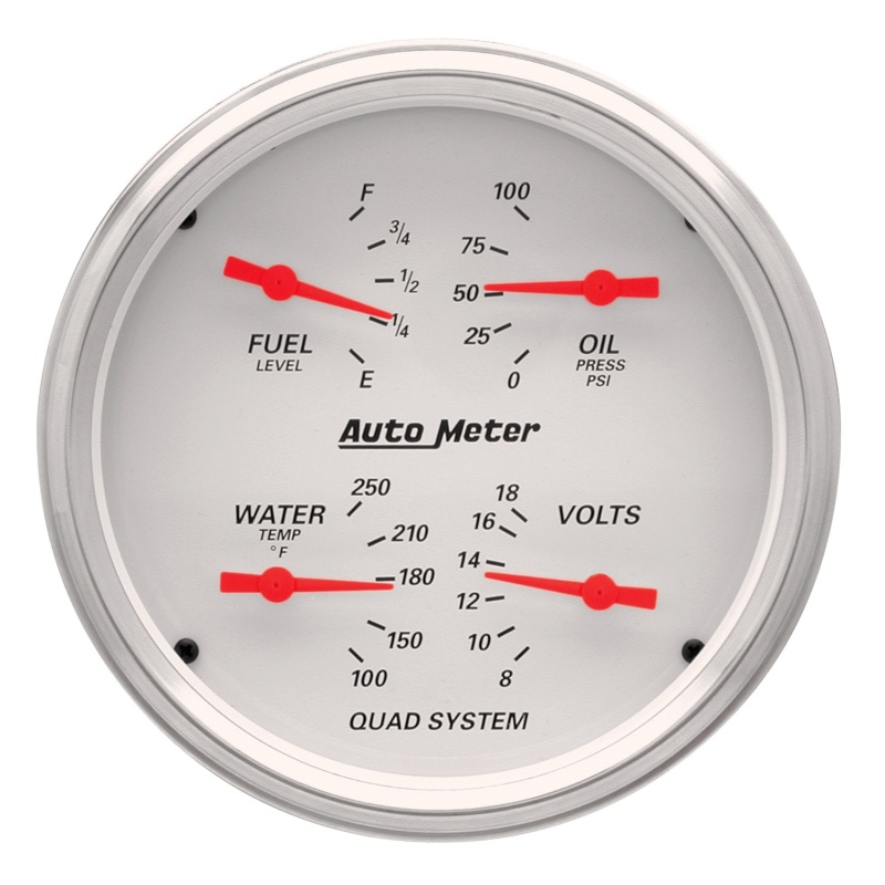 Sometimes Space Is Limited. The Autometer Quad Gauge Provides A Solution To Limited Dashboard Space While Providing A Clean Look. Individual Autometer Air Core Meter Movements For Each Function Provide The Accuracy And Durability Required By Even The Most Demanding Applications. Includes A Single Wire 1/8" Npt Temperature Sender And A 1/8" Npt Oil Pressure Sender. The Voltmeter Reads From 8-18V On Negative Ground Electrical Systems And Fuel Level Resistance Range Is 240 Ohms Empty To 33 Ohms Full (Compatible With Autometers 3262 Fuel Level Sender).