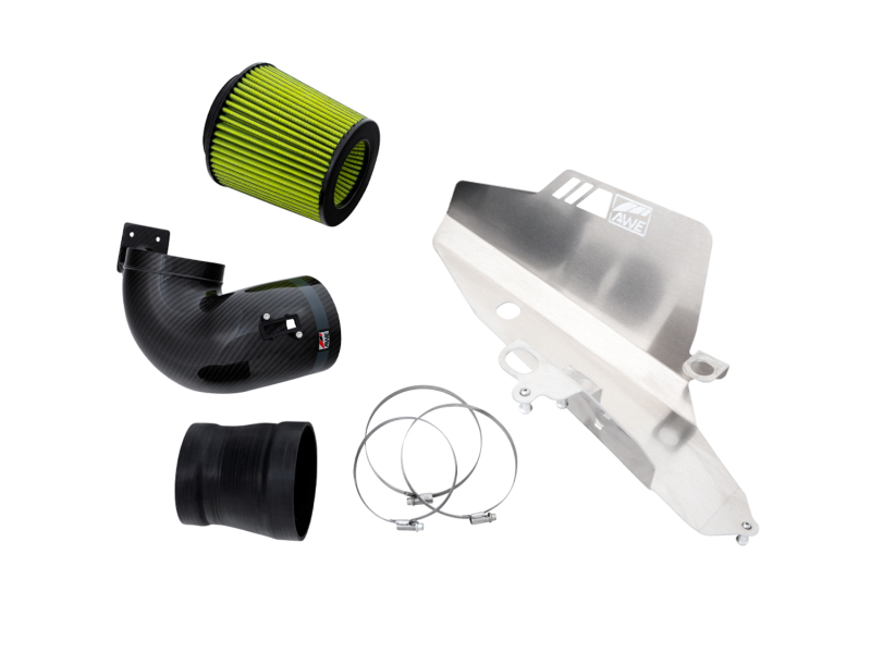 4.5" of carbon induction. Presenting the AWE S-FLO Carbon Intake Suite for the Toyota GR Supra. The S-FLO Carbon Intake is a full, modular replacement for the factory airbox. Featuring a 4.5” diameter inlet tube, and a massive oil-less inverted cone filter that provides 71% increase in filter surface area over stock... you're looking at an ample dose of upgraded induction worthy of dyno-proven 15 hp and 21 lb-ft of torque at the wheels (stage 1 software). A bespoke CNC laser-cut aluminum support bracket secures the S-FLO Carbon Intake, complete with machined aluminum mounting barbs. The genuine 2x2 twill carbon construction integrates a machined aluminum sensor fitting for OE-like fitment and CEL-free performance. For the full carbon experience, AWE S-FLO Carbon Lid are available seperately.