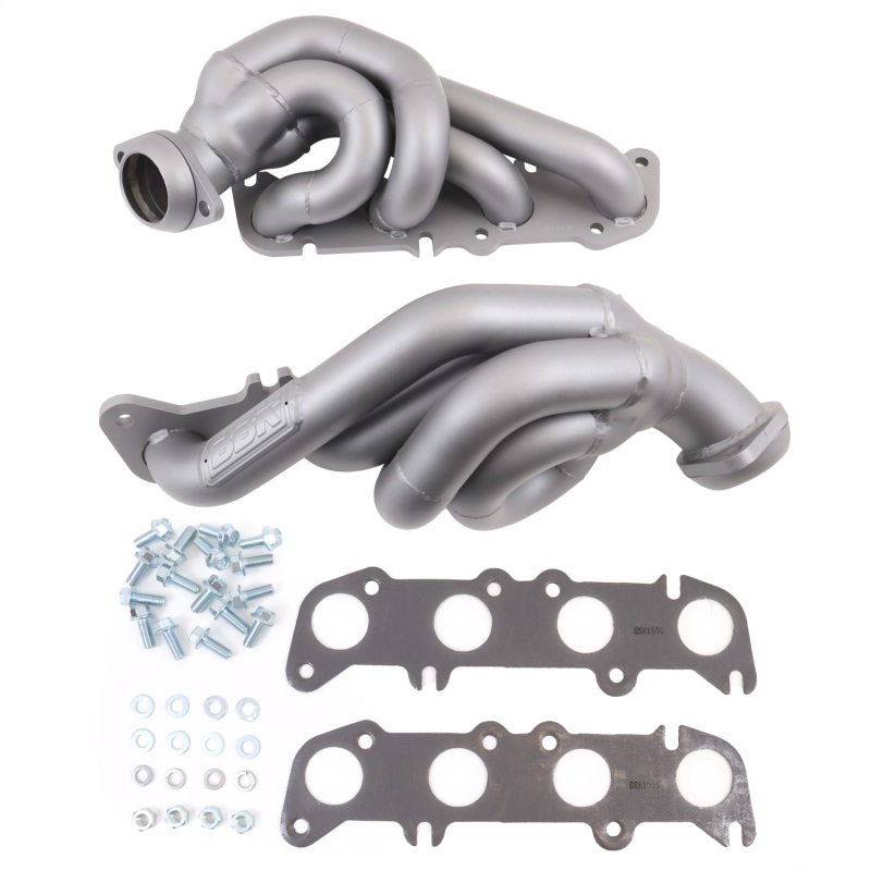 These BBK Performance shorty tuned Length exhaust Headers are designed and constructed as direct fit replacements for all 2011-2014 Ford 5.0L COYOTE F150 truck applications. Each header is manufactured with 1-3/4 in. CNC mandrel bent tubing that offers unrestricted exhaust flow for increased horsepower and torque over factory OEM manifolds. BBK tuned Length headers offer improved scavenging waves for better combustion, which leads to improved performance and fuel economy over stock or equal Length headers. As with all BBK Performance exhaust headers they feature a 3/8 in. laser cut exhaust header flange for additional strength and a guaranteed leak free fit. All headers are robotically and precision hand welded and then pressure tested to ensure years of reliability and performance in the real world. All BBK exhaust headers are available in a Titanium Ceramic or Polished Silver Ceramic coated finish. All Kits include new exhaust header gaskets, header bolts and hardware to complete the installation.