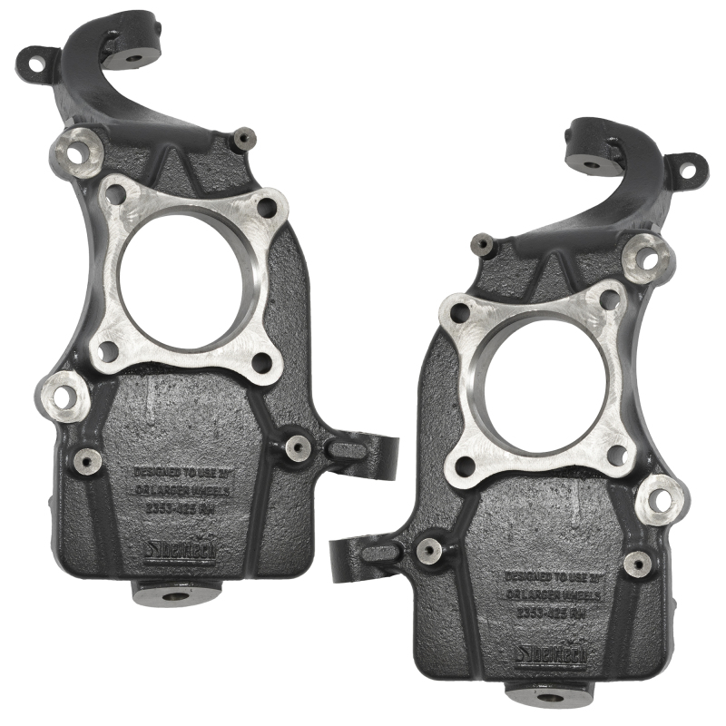 In 1983, Belltech developed one of the industry's first revolutionary products to help jump start the Sport Truck craze, the Drop Spindle. By relocating the spindle pin (Note: Application, while improving handling and retaining factory ride quality. Belltech spindles maintain critical suspension geometry and eliminate excessive ball joint, shock and tire wear common to other methods of lowering. Each spindle is crafted from powdercoated, CNC machined, high strength ductile iron castings providing the structural integrity to meet and exceed all factory specifications & requirements.
