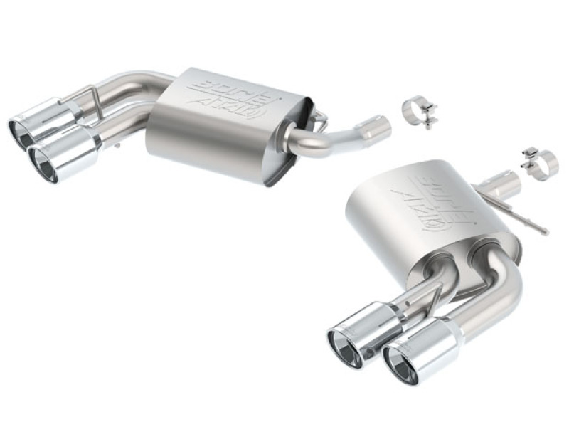 This Axle-Back system has Dual Tips on each muffler assembly and will fit vehicles with Dual Mode Exhaust (NPP) valves but it does NOT include Dual Mode Exhaust (NPP) valves. It may be used on vehicles that came from the factory with singe tips but you MUST change the rear bumper valance to accommodate the dual tips. Adapter Kit 60605 can be used to add NPP valves to this system. The system delivers the aggressive ATAK(r) sound with no drone inside the vehicle. System features a 2.25" diameter inlet,1) 2.5" tail pipe and 1) 2.75" tail pipe, and dual 4" round polished T-304 stainless steel tips on each muffler assembly. Borla(r) ATAK(r) (Acoustically Tuned Applied Kinetics) technology is designed for high-performance purists who prefer exhaust sound over their stereos. ATAK(r) equipped exhaust systems deliver the highest available dB (decibel) levels in the Borla(r) street-legal line-up... and unlike inferior brands that lose significant sound quality at higher volumes, ATAK(r) is tuned like a graphic equalizer to shape and focus sound waves for optimum high-volume output. ATAK(r) technology is based on specifically-tuned attributes of the internal muffler cores, which are calibrated on a vehicle-by-vehicle basis to deliver the most desirable sound. The power of Borla(r) Multicore technology, with the sound of vehicle-specific acoustic tuning. Each system is built from premium T-304 stainless steel, superior to T-400 series knockoffs (such as 409), to give you the absolute best in performance and durability. Ultra-smooth mandrel bends ensure maximum flow & power, and precision computer numerical control (CNC) manufacturing ensures an accurate fit. Best of all, Borla(r) stands behind every system with a Million-Mile Warranty. Just what you'd expect from the world's most experienced (and most winning) exhaust brand.