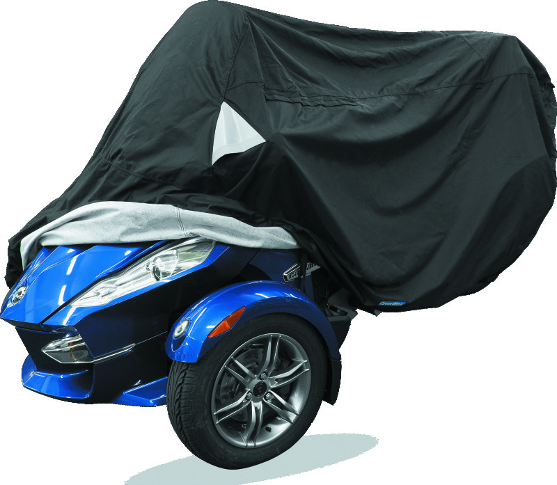 Heavy-duty, top of the line, all-weather cover from CoverMax® by BikeMaster® that is designed specifically for trikes. Waterproof seams, 300-denier polyester with PU coating. Ultra-soft 30g velour lining helps protect paint from scratches. Two top covered vents improve ventilation and help reduce condensation build up. Vent covers are reflective for added visibility and security. Convenient access panel without removal of cover. Windshield liner helps protect windscreen from scratching. Extra-wide tail slot accommodates multiple radio antennas. Tailor-fit elastic skirt and adjustable hook-and-loop center strap helps secure the cover and gives a custom style fit. Built-in grommets for use of security cable lock (cable lock not included). Available for metric or Harley-Davidson® trikes and/or Spyder roadster.