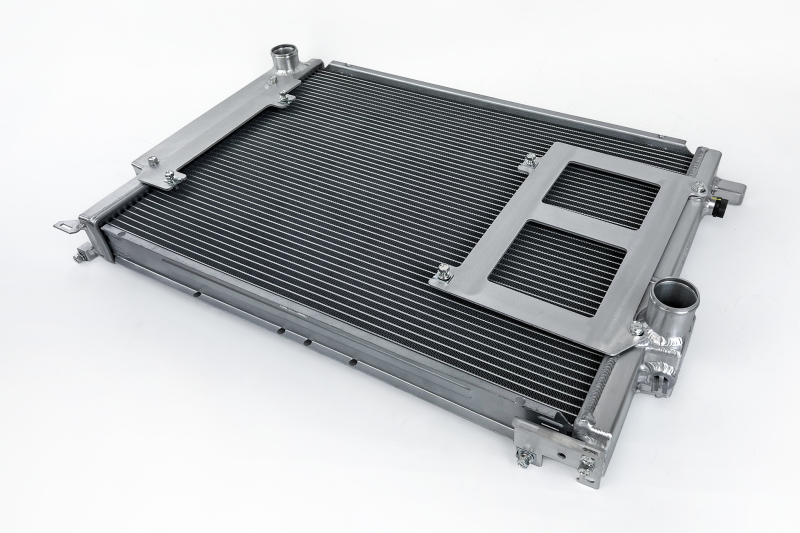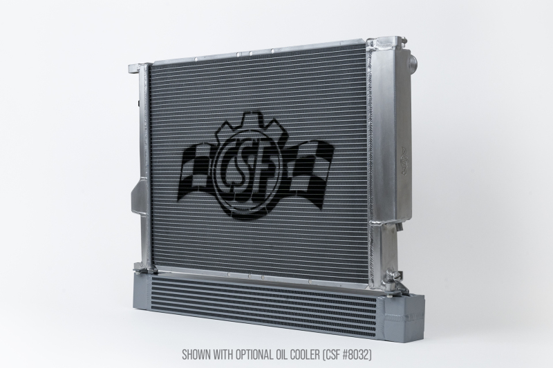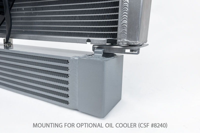 Because the S54 requires a much more robust oil cooling system than the E36's S52, CSF made special provisions to fit two different race spec oil coolers. To do this, the height of the radiator was reduced slightly so the oil coolers can fit under it in a factory style location. The radiator includes mounting brackets which can be adjusted to fit both oil coolers (CSF #8032 & #8240). CSF also includes brackets for an electric fan conversion. These brackets are designed to fit a single 16 inch SPAL Fan (not included). While it is possible to retain a clutch type fan, it is much easier to convert to an electric fan on top of the performance benefits.