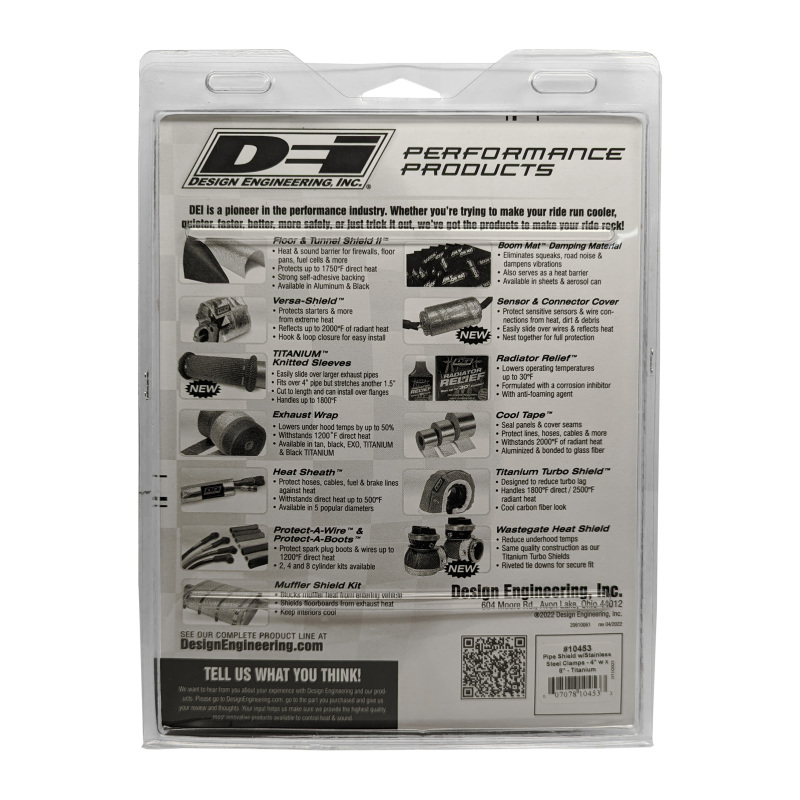 Pipe Shields solve the problem of needing spot heat protection for exhaust pipes and components. Extreme heat can rob power and potentially damage engines, transmissions, hoses, and sensitive electrical components. DEI, a market leader in thermal protection, has introduced a revolutionary advancement in pipe shield technology that greatly outperforms Mylar-backed glass fiber shields. DEI's Titanium Pipe Shield combines the high heat tolerance of DEIÂ's proprietary LR fiber technology with a unique rivet-based clamp shield design to improve heat dissipation and cooling. Glass fiber shields can begin to fail at 900°F with the Mylar outer material cracking and flaking off. DEI's Titanium Pipe Shield provides heat protection up to 1350°F. LR fiber technology is a two-ply material. The outer layer is made from pulverized and stranded lava rock into a proprietary tightly woven weave for durability and strength. The inside material is made of a special high temperature resistant fabric (89% silica) designed to withstand 350 degrees more heat than glass fiber. This proprietary fiber technology combined with DEI's unique shield standoff bracket design provides an air gap between the shield and pipe that together provides the maximum potential for cooling and heat dissipation. With the strategic placement of DEI's Titanium Pipe Shield near transmissions, brake lines, floorboards, body panels, diesel exhaust stacks or motorcycle pipes, radiant heat can be controlled for maximum protection and performance. Other uses include isolated areas such as sections of the exhaust pipe after the collector, an area that can heat transmission fluid, or along the path of an exhaust system in proximity of gas tanks, differentials and rear facias. The shield is designed for multiple automotive applications as well as marine, powersports, diesel and industrial applications where heat dissipation and thermal control is needed.
