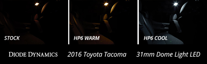 Features Direct replacement for factory 31mm festoon bulb Adds more modern LED appearance Plug and play simple installation Overview Design. The 31mm SMF2 LED bulb is a direct replacement for any 31mm-size bulb commonly found in vanity mirror lights in many vehicles. Populated with two 5050-size SMDs the SMF2 upgrades the factory yellowish incandescent bulb to a more modern LED appearance while adding far more total light output than the factory bulb. The SMF2 was designed with an embedded load resistor and implanted diode for superior reliability. With its durable metal terminals it will fit snugly in the socket and its light weight means it won't vibrate loose over time. Reliability. Unlike other bulbs on the market this bulb is built with constant-current circuitry along with transient suppression. That means this bulb will last for years not months with no flickering or failure. And like every Diode Dynamics product it's backed by an industry-leading three-year replacement warranty. Brightness. With 24 lumens of true measured output the SMF2 LED will provide about double the total light compared to your original 31mm-sized bulb. All Diode Dynamics LED lighting is rated with accurate measured lumen figures not calculations or guesses. We test the true output in-house and provide you the real numbers to compare. Colors. In addition to vibrant colors of blue red amber and green the SMF2 is available in a cool white 6000K and warm white 3000K option as well. Whether you want a modern cool white appearance or a traditional warm white color we have the color to fit your need!
