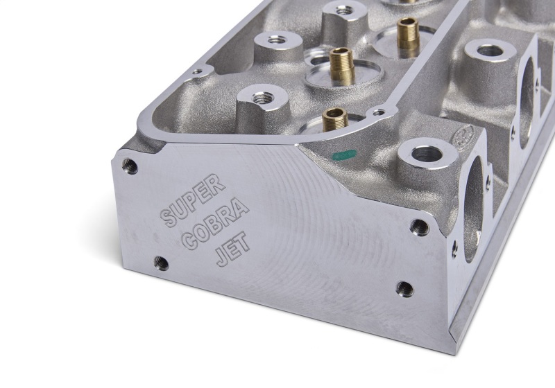 Ford Racing teamed up with Jon Kaase to redesign their 429 Cobra Jet cylinder heads, and the results are these Super Cobra Jet heads. They feature revised valve angles and locations to reduce cylinder wall shrouding and improve flow, along with redesigned combustion chambers to accommodate the more centrally located valves. These heads use the same valves, valve springs, retainers, and 7/16 in. stud-mounted roller rockers as the current Ford Racing 429 Cobra Jet heads, and the standard Cobra Jet intake and exhaust manifolds bolt right on. This new design offers a 25-50 HP increase over current Cobra Jet heads, depending upon displacement and camshaft.