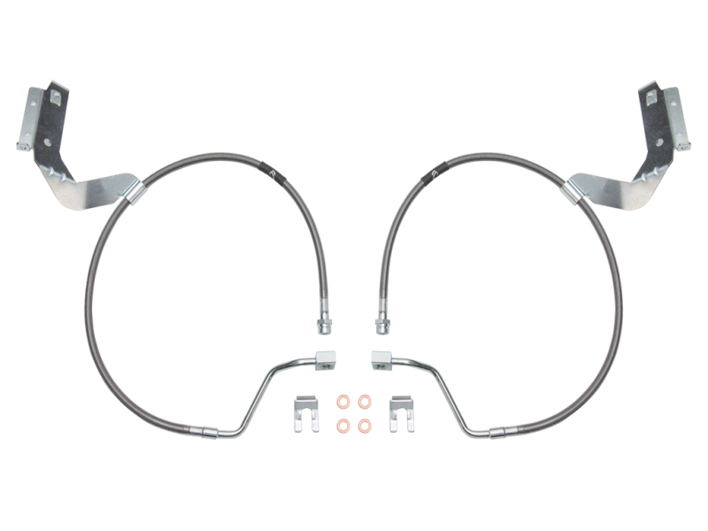 The ICON Vehicle Dynamics 4.5-7” Lift Extended Brake Line Kit for the 2017-2025 Ford F-250/F-350 Super Duty is an excellent upgrade for the front of lifted Super Duty Trucks. These high-quality stainless steel braided brake lines feature an extended length to prevent over extending of OE brake lines on trucks with 4.5-7” of front lift or the requirement to bend factory hard brake lines to work with drop brackets during installation of the suspension system. Their direct bolt-in design bolts directly to the OE hard lines and brake calipers without any additional hardware required, making installation a breeze.
