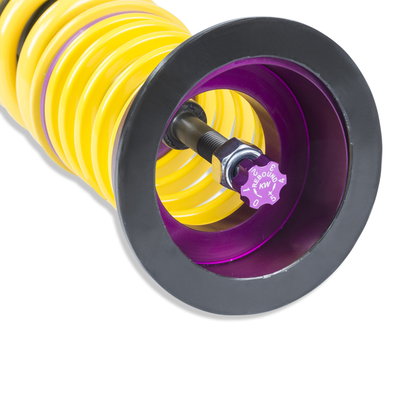 Cutting-edge motorsports technology for more performance on the road. Like every suspension product developed by KW automotive, the suspension manufacturer, and manufactured in Germany, the KW V3 Coilover suspension kit also provides a significant plus in safety reserves in road traffic. Thanks to the chassis with its high-quality dampers, springs, and elastomer spring elements, pitching and rolling movements during load changes such as evasive maneuvers, cornering, acceleration, and braking are significantly reduced. The braking distances are also shortened. Thanks to improved support and feedback, drivers not only feel safer but driving in everyday life becomes even safer. With compression and rebound stage damping, that can be set separately and independently of each other, the damper setup can be customized to your personal driving preferences or vehicle changes such as weight, tire characteristics, or altered vehicle rigidity. True performance optimization is only possible with this unique, patented system. For example, this allows the compression damping force to be increased and get more grip from the tires, to improve cornering behavior and reduce squat without simultaneously altering the rebound stage damping which is optimally matched to the spring rate, a scenario which results in reduced grip and the associated loss of performance. The KW V3 coilover kit is the ideal tool for performance-oriented drivers and experienced tuning enthusiasts who place a strong emphasis on the overall performance of their suspension. The Variant 3 features patented TVR-A and TVC-A technology that provides separately adjustable rebound and compression damping. The extensive adjustment range of the independently configurable rebound and compression make it easy to directly influence the steering behavior, directional stability, grip and handling characteristics for confident and repeatable results at the limit of driving dynamics.