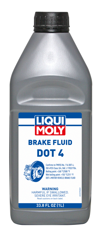 Liqui Moly DOT 4 brake fluid can be used with all conventional brake fluid bleeding devices. Liqui Moly DOT 4 brake fluid is miscible and compatible with all high-quality synthetic brake fluids. The optimal period of use for this brake fluid is, however, only ensured when it is used alone. It is recommended that the brake fluid be changed in accordance with the specifications from the vehicle manufacturer. Caution: Brake fluid corrodes the paintwork of cars; in the event of spillage, rinse immediately with plenty of water. Do not use in mineral oil based central hydraulic systems. Observe manufacturers instructions!