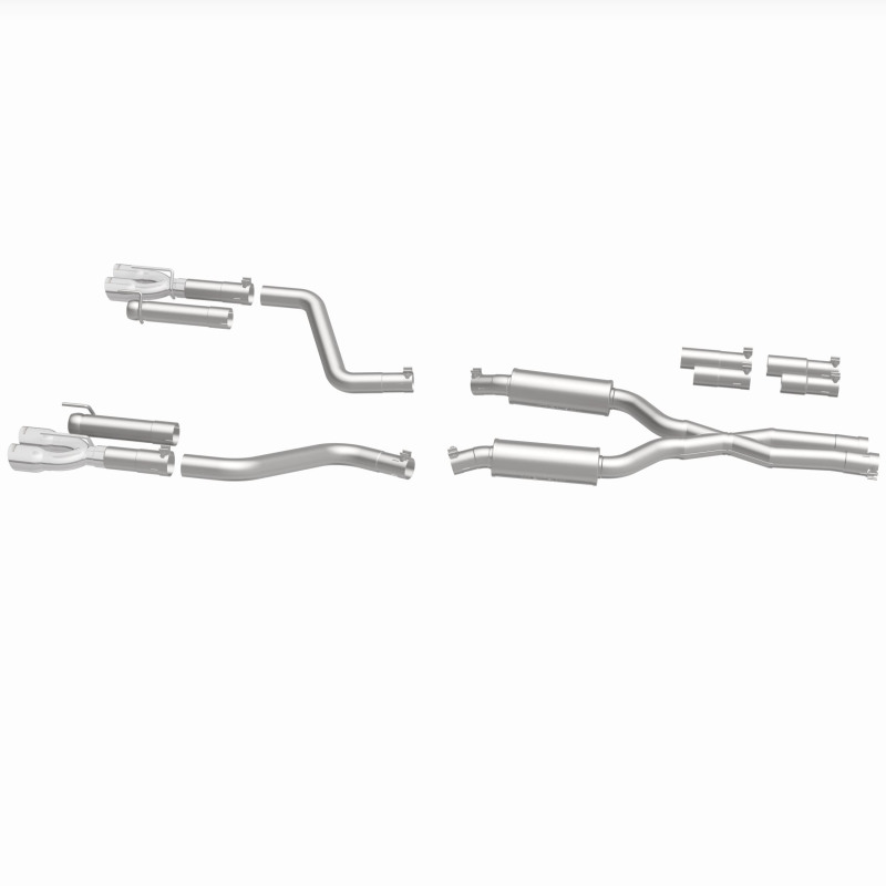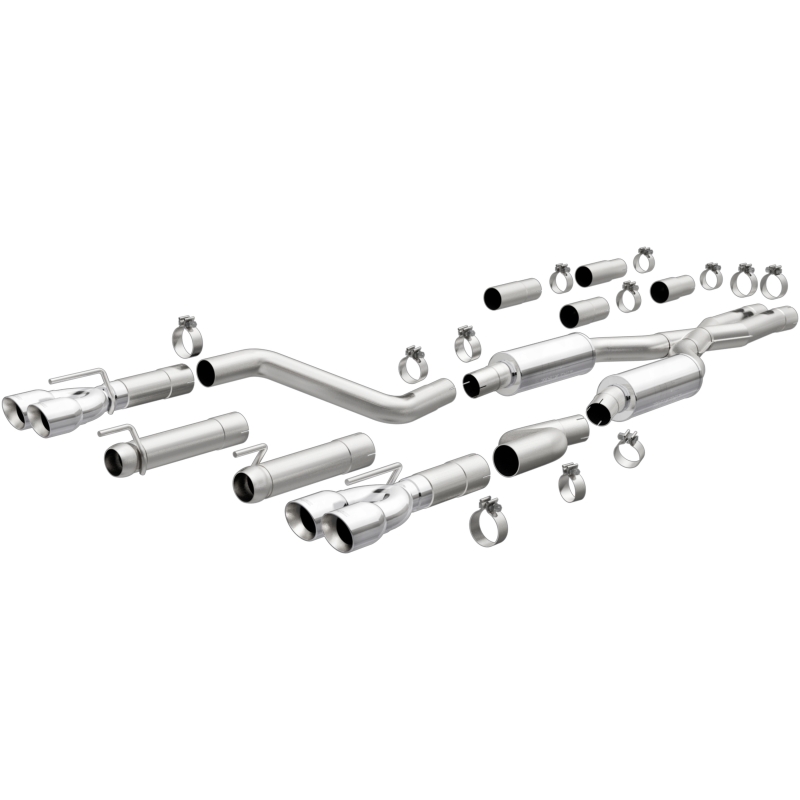 The MagnaFlow 2015-2023 Dodge Challenger Competition Series Cat-Back Performance Exhaust System 19367 brings an aggressive, attention-grabbing edge to the deep resonant exhaust note we're so well known for. This exhaust kit is designed to enhance your 5.7L, 6.2L, 6.4L 2015-2023 Dodge Challenger with dyno-proven performance made possible thanks to fast-flowing mandrel bent 3in. main piping and 2 Straight-Through mufflers ending in a Quad Split Rear exit with 3.5in. Polished Welded-On Double Wall Angle Cut Folded Edge tips featuring a sporty finish. The exhaust system's cat-back layout replaces your ride's exhaust system from near the catalytic converter on back. Exhaust system 19367 is engineered to make your vehicle's engine produce Aggressive exterior and Moderate interior sound levels, befitting its competition-oriented design. 19367's direct-fit design makes installation a breeze thanks to the use of advanced 3D scanning techniques. This performance exhaust system is made of 100% durable and corrosion-resistant stainless steel and produced using CNC precision robotic manufacturing, all backed by MagnaFlow's limited lifetime warranty. Please check to ensure compliance with local noise regulations.
