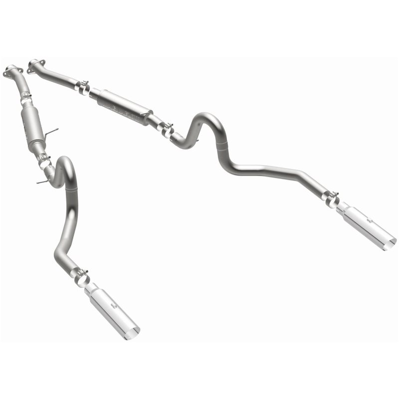 The MagnaFlow 1994-1998 Ford Mustang Competition Series Cat-Back Performance Exhaust System 15677 brings an aggressive, attention-grabbing edge to the deep resonant exhaust note we're so well known for. This exhaust kit is designed to enhance your 4.6L, 5.0L 1994-1998 Ford Mustang with dyno-proven performance made possible thanks to fast-flowing mandrel bent 2.5in. main piping and 2 Straight-Through mufflers ending in a Dual Split Rear exit with 3.5in. Polished Clamp-On Single Wall Angle Cut Cut Edge tips featuring a sporty finish. The exhaust system's cat-back layout replaces your ride's exhaust system from near the catalytic converter on back. Exhaust system 15677 is engineered to make your vehicle's engine produce Aggressive exterior and Moderate interior sound levels, befitting its competition-oriented design. 15677's direct-fit design makes installation a breeze thanks to the use of advanced 3D scanning techniques. This performance exhaust system is made of 100% durable and corrosion-resistant stainless steel and produced using CNC precision robotic manufacturing, all backed by MagnaFlow's limited lifetime warranty. Please check to ensure compliance with local noise regulations.