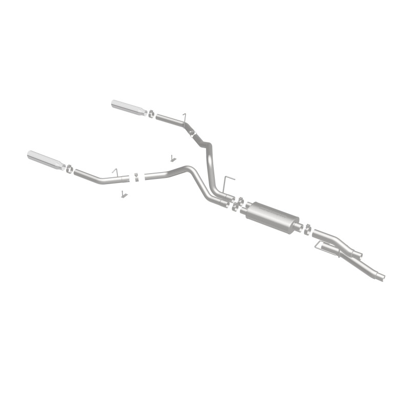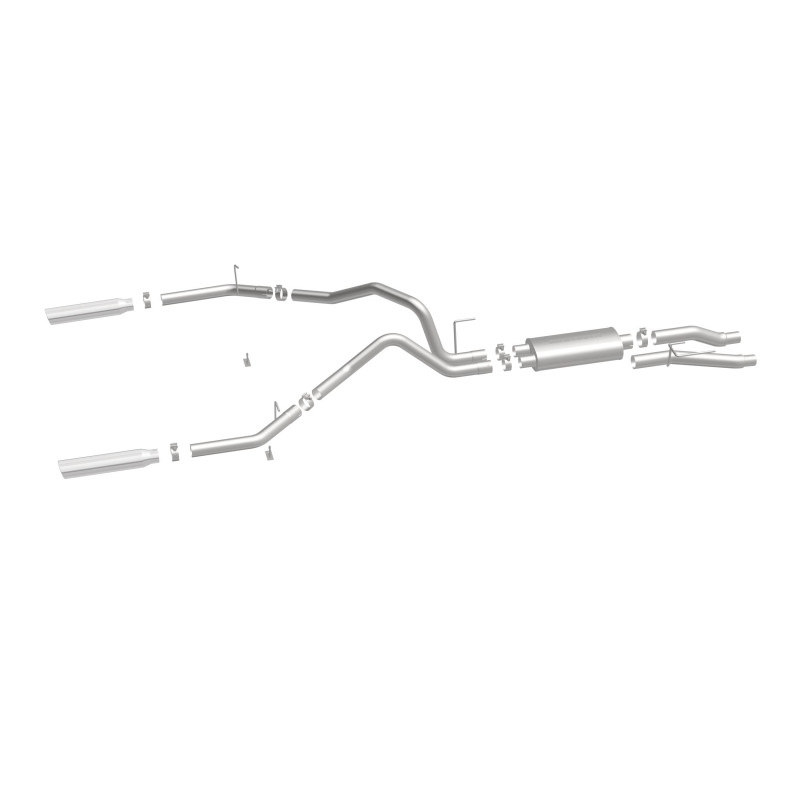 The MagnaFlow Street Series Cat-Back Performance Exhaust System 16520 brings out the personality of your Truck with our signature resonant, powerful engine tone and dyno-proven performance. Thanks to its fast-flowing, mandrel bent 3in. main piping and 1 Straight-Through mufflers ending in a Dual Split Rear exit with 3.5in. Polished Clamp-On Single Wall Angle Cut Rolled Edge tips, this Truck exhaust kit has the performance chops to match its sporty sound and appearance. Upgrade your ride to the next level with an exhaust that has the pipes to put other Truck's to shame. With this system your vehicle will be producing Aggressive exterior and Moderate interior sound levels while leaving other cars and trucks feeling envious at every stoplight. Exhaust kit 16520 features a cat-back layout that replaces your ride's stock exhaust components from near the catalytic converter on back. Extensive 3D scanning during development has resulted in a direct-fit design that you can easily install yourself. 16520 is produced using CNC precision robotic manufacturing techniques and is backed by MagnaFlow's 1-year limited finish warranty and limited lifetime construction warranty.
