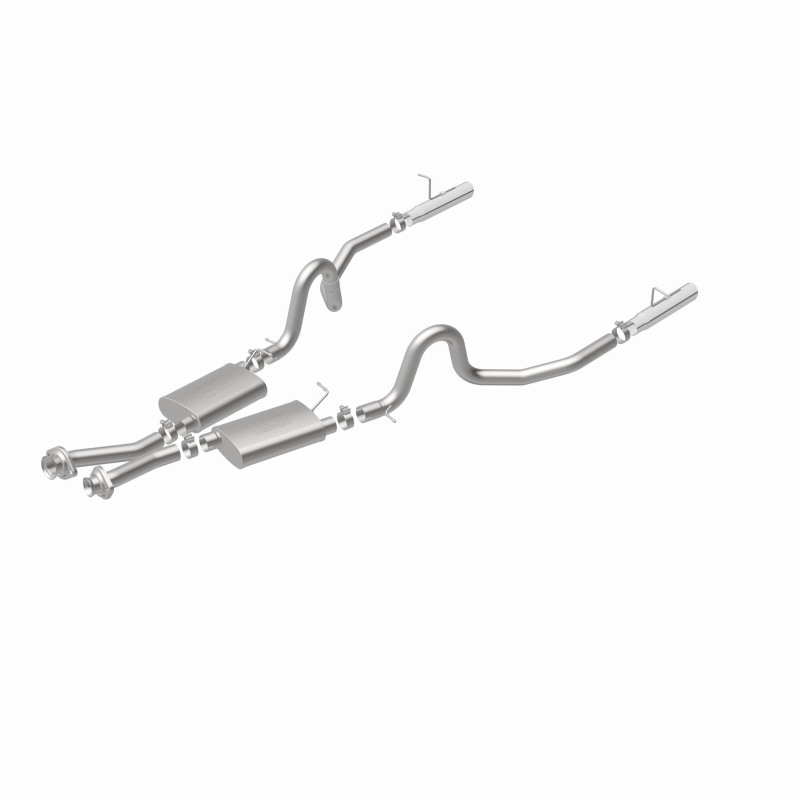 The MagnaFlow 1986-1993 Ford Mustang Street Series Cat-Back Performance Exhaust System 15630 brings out the personality of your 5.0L 1986-1993 Ford Mustang with our signature resonant, powerful engine tone and dyno-proven performance. Thanks to its fast-flowing, mandrel bent 2.5in. main piping and 2 Straight-Through mufflers ending in a Dual Split Rear exit with 3in. Polished Clamp-On Single Wall Angle Cut Cut Edge tips, this Ford Mustang exhaust kit has the performance chops to match its sporty sound and appearance. Upgrade your ride to the next level with an exhaust that has the pipes to put other Ford Mustang's to shame. With this system your vehicle will be producing Moderate exterior and Mild interior sound levels while leaving other cars and trucks feeling envious at every stoplight. Exhaust kit 15630 features a cat-back layout that replaces your ride's stock exhaust components from near the catalytic converter on back. Extensive 3D scanning during development has resulted in a direct-fit design that you can easily install yourself. 15630 is produced using CNC precision robotic manufacturing techniques and is backed by MagnaFlow's 1-year limited finish warranty and limited lifetime construction warranty.