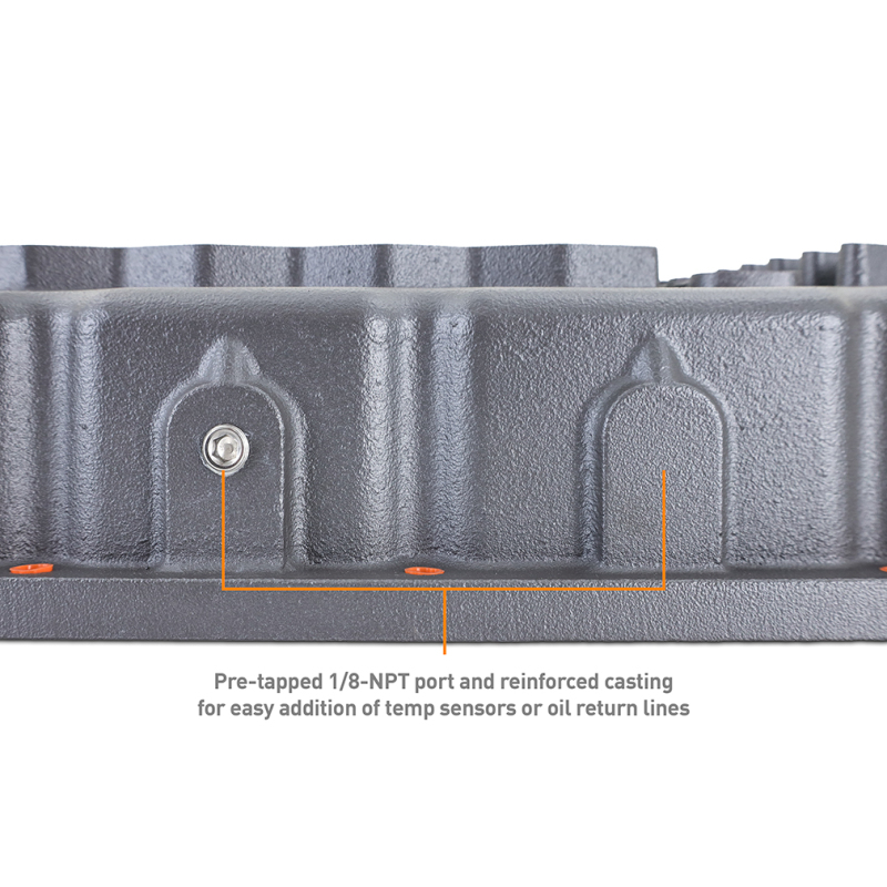 This Mishimoto Aluminum Transmission Pan is a direct-fit, high-performance upgrade for your 2007.5+ Dodge Ram 6.7L Cummins. Cast from high-quality aluminum and powder coated Gunmetal Gray, our transmission pan is a robust and long-lasting upgrade for your vehicle's transmission. With a sleek design and bottom ribs, this pan not only adds to the overall aesthetic of your truck but also provides improved cooling performance.----This transmission pan features internal baffles that reduce sloshing and enhance heat dissipation, resulting in smoother transmission performance. Our casting features a precision-machined sealing surface, ready to accept either a factory-style gasket or sealant of your choice (not included). Additionally, the Mishimoto 2007.5+ Dodge Ram 6.7L Cummins Aluminum Transmission Pan adds an extra 2.6 quarts of ATF to help maintain optimal transmission operation.----Fed up with the frustration of trying to hold up a transmission pan with one hand while threading the fasteners in with the other? Mishimoto has you covered with pre-installed bolt retainers that hold the fasteners in the pan, allowing you to easily thread the bolts without dropping them on the ground, your head, or worse, that pan of nasty transmission fluid you just drained. Additionally, our pan comes equipped with a magnetic drain plug for easy draining and a 1/8-inch NPT port and plug for temperature sensors to make servicing your transmission and monitoring temperatures a breeze.----This direct-fit upgrade offers affordable durability and helps maintain smooth transmission operation, ensuring a long life for your transmission. Like all Mishimoto products, this transmission pan is backed by the Mishimoto Lifetime Warranty.