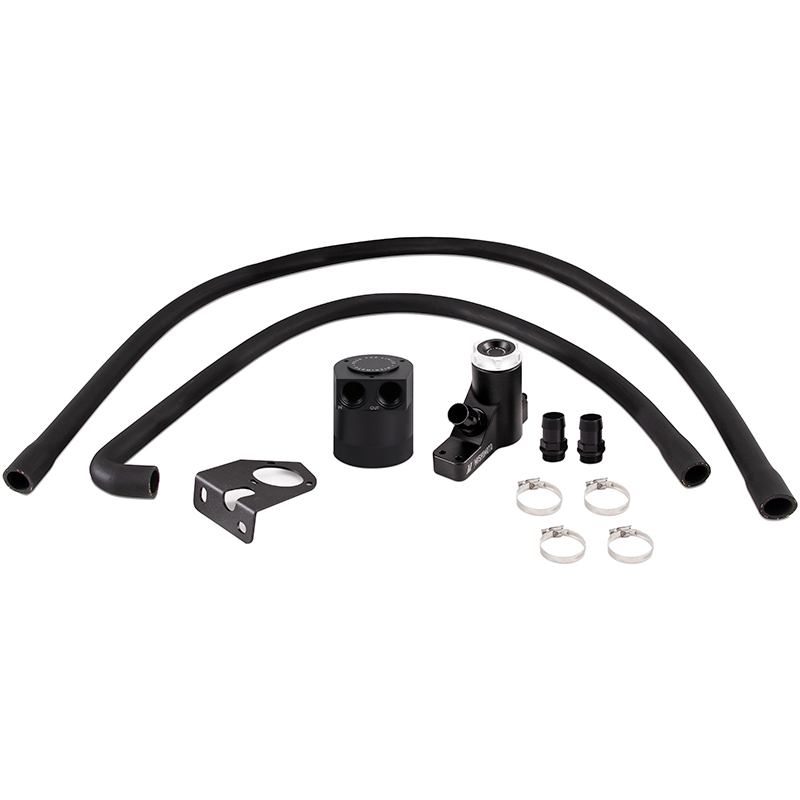 High-output engines require high-flow crankcase ventilation. Our high-flow catch can utilizes a high-capacity bottom with a 5.3 fl. oz. capacity. The CNC-machined lid includes large, M27 x 2.0 inlets and outlets to let your crankcase breathe. Inside the can is a CNC-machined baffle with integrated filter that lets crankcase gases flow through while filtering out potentially harmful fuel, oil, and water vapors. Like our compact baffled oil catch can, our high-flow catch can and filter are fully serviceable for easy draining and cleaning.To make this kit a direct fit for your 2008-2010 Ford 6.4L Powerstroke, Mishimoto includes a custom-engineered, 3mm-thick steel bracket. This bracket mounts the can in an easy-to-access location under the truck using existing mounting holes. This mounting location allows for quick and easy servicing, without even opening the hood. The catch can bracket is powder-coated black to protect it from the elements and includes stainless steel hardware to withstand the test of time.Our kit also includes a CNC-machined, black anodized, aluminum oil fill neck and machined aluminum cap. This fill neck doesn't just improve your truck's under-hood aesthetics, it also eliminates the stock air-oil-separator that drains blow-by vapors back into the engine, keeping your engine running cleaner. The durable Mishimoto aluminum oil cap replaces the failure-prone ratcheting cap so you never have to worry about a stuck cap preventing you from adding oil.Also included with this kit is a set of direct-fit hoses to carry blow-by away from your engine and into the Mishimoto catch can. For even more protection, this 2008-2010 Ford 6.4L Powerstroke Baffled Oil Catch Can is backed by our Mishimoto Lifetime Warranty.