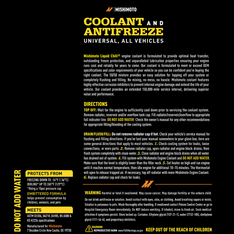 Mishimoto's Liquid Chill Original Equipment engine coolant is formulated with an ethylene glycol base to provide optimalheat transfer, boiling protection up to 265F, freeze protection down to -34F, unparalleled anti-corrosion, and superiorlubrication, ensuring your engine runs cool and reliably for years to come. The pre-diluted 50/50 mixture provides an easysolution for topping off your system or complete flushing and filling. No mixing, no mess, no hassle.----We offer bothuniversal and color-coded formulas that match your vehicle manufacturer' s specifications to make selecting the rightcoolant easy. Our coolant provides an extended 5 year/150,000-mile service interval, delivering superior value andperformance. This one-gallon bottle of yellow coolant is specially formulated to be compatible with all coolant types andit meets ASTM D3306, D6210, D4985, BS6580, and KS K2234 specifications for all makes and models
