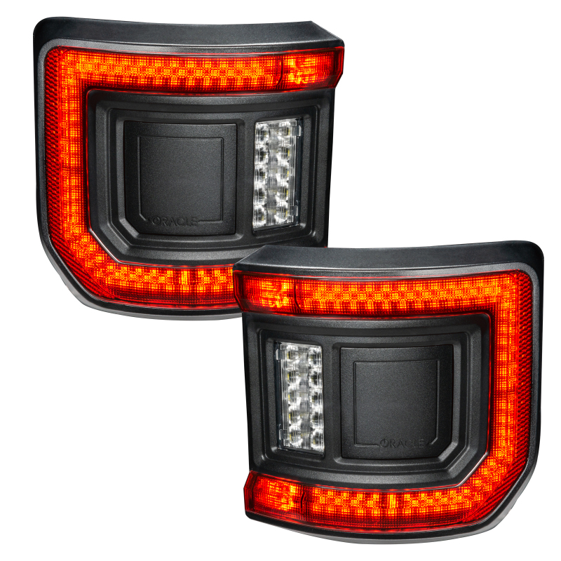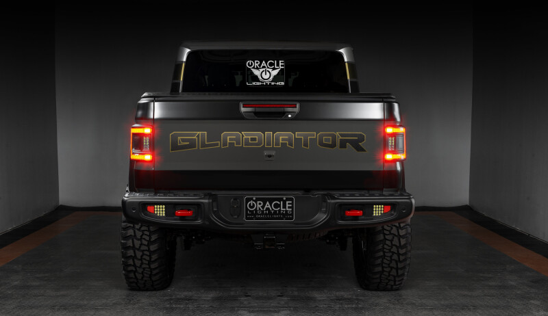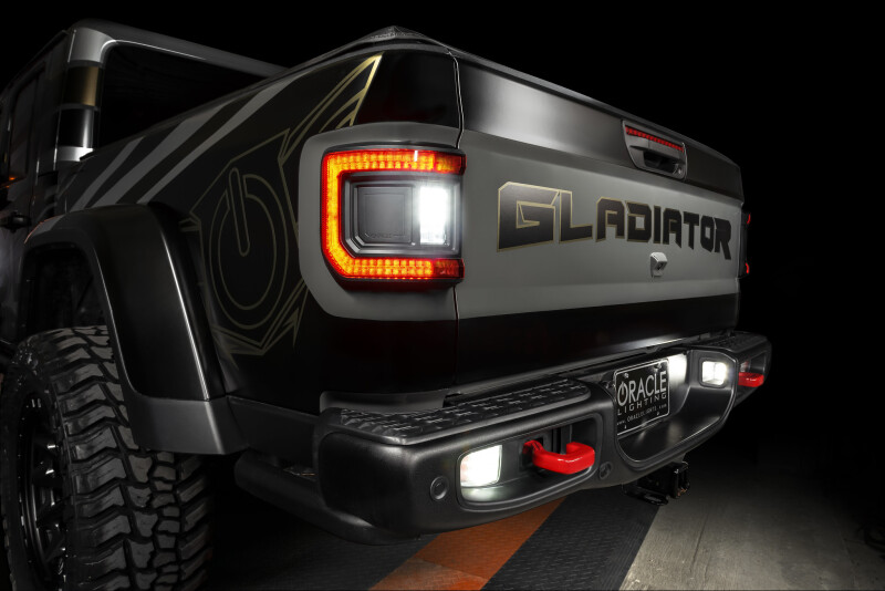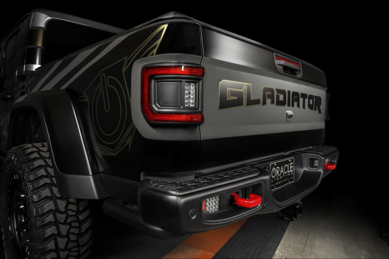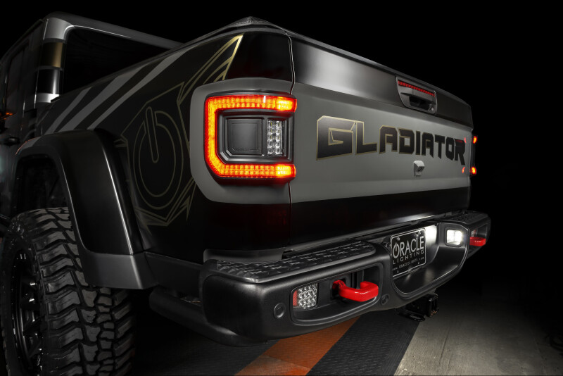 Designed to fit flush with the truck bed of the Jeep Gladiator, the new JT Flush Tail Lights from ORACLE Lighting offer new LED features and improved styling. This innovative design is a sleek tail light for Jeep Gladiators that wraps tightly around the truck. Protruding out significantly less than the factory tail lights, this low-profile design avoids damage while trail riding. Because of the nearly flush wrap-around design, the lighting can be visible from any rear angle, making it a unique solution for the Jeep. These Jeep Gladiator tail lights provide improved aesthetics and functional LED lighting features including high-powered reverse lights and signature perimeter lighting. In addition to standard features, the plug-and-play design features an enhanced reverse function and caters to the Jeep's optional cross-traffic sensor. The reverse light features 12 high-powered LEDs for optimal rear illumination. The cross-traffic sensor can be swapped directly over from the factory assembly and easily installs into the ORACLE Lighting tail lights for Jeep Gladiator. These flush-mount tail lights are compatible with base and LED packages. Gain sleek styling that compliments the original body lines and tons of innovative features. With the superior quality and durability that ORACLE Lighting is known for, these tail lights are the perfect upgrade for your Jeep Gladiator!
