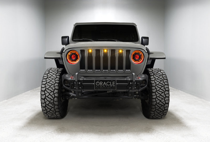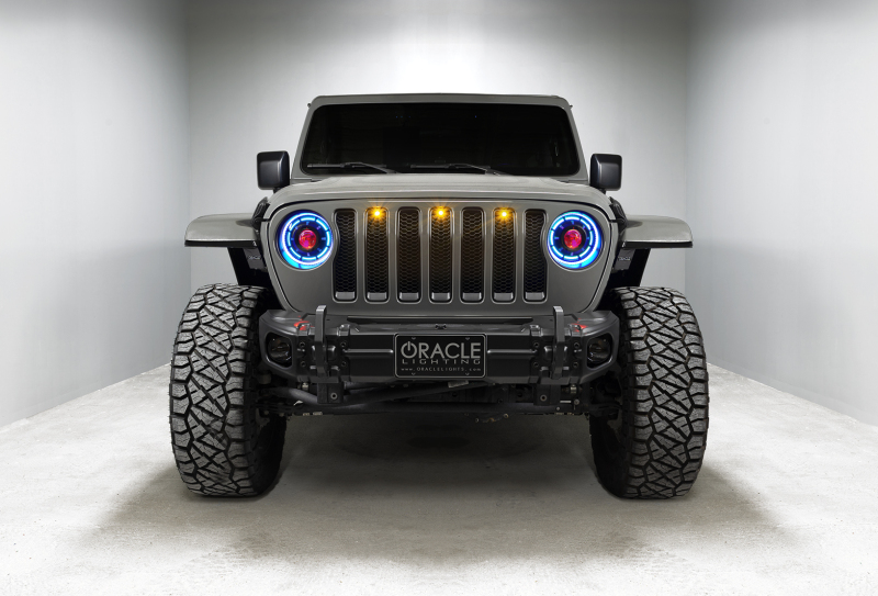 The Popular Oculus Bi-LED Headlights by ORACLE Lighting are now available in a ColorSHIFT(tm) RGB+W Color-Changing version. Oculus Headlights feature advanced focused LED projection that outshines all the competition (including the factory LED headlights). With 4,800 Lumens of high-quality Bi-LED projection, these headlights provide enhanced driver visibility in all weather conditions. Light focus is very important for driver safety and for others who can have their vision obstructed by glare. We are proud to offer the most focused & lowest-glare LED Headlights for the JL and JT on the market. Each LED feature has a separate cable output and can be connected together so all 3 create the same color or set up as 3 separate Channels or zones depending on the user preference and the ColorSHIFT(tm) controller selected. Please note that these features are intended for off-road show use only and are not compliant for street use. The Pure-White DRL has its own wiring harness (same as the original Oculus) that connects to the fuse box with an add-a-circuit for easy and safe integration. The DRL will come on when the engine is running or can be connected to a switch (including the factory Aux switches) for additional user control.