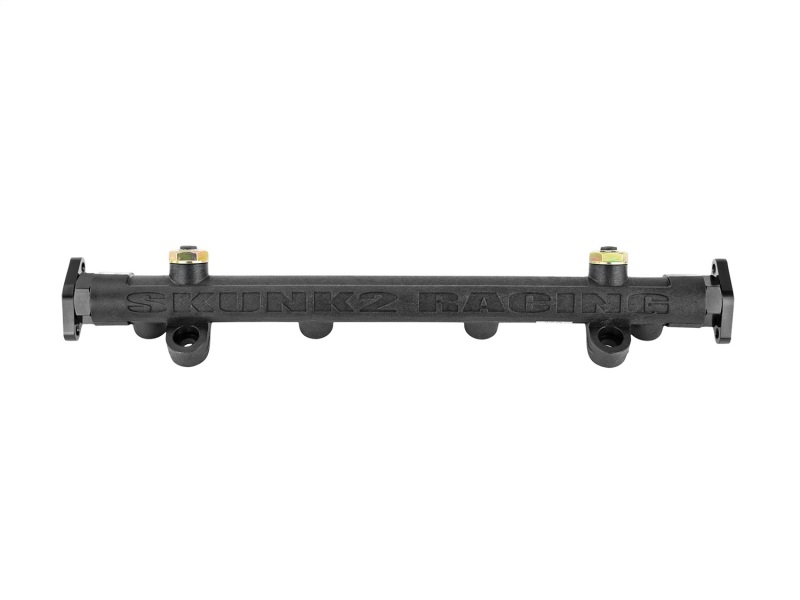 Skunk2's cutting-edge Composite Fuel Rail for the Evo VIII-IX is here. Skunk2's Composite Fuel Rails are made using a proprietary carbon-impregnated, aerospace thermo-polymer composite—a material that's 33-percent lighter, 60-percent stronger, and operates up to 100-degrees F cooler when compared to aluminum and insulates fuel from both radiant and conductive heat transfer underneath the hood, resulting in increased horsepower and torque. Composite Fuel Rails also feature large 0.625- in. internal bores for superior fuel injector pulsation dampening, are machined with a smooth interior finish, and feature radius-cut fuel injector outlets for improved flow characteristics. The special design that eliminates the sharp internal angles where the main bore meets the fuel injector bores inherent with conventional extruded- and drilled-aluminum designs can only be achieved with such composite materials. Skunk2's Evo Composite Fuel Rails are compatible with the factory fuel system, as well as all fuels, including alcohol, and can support up to 1,200 hp.