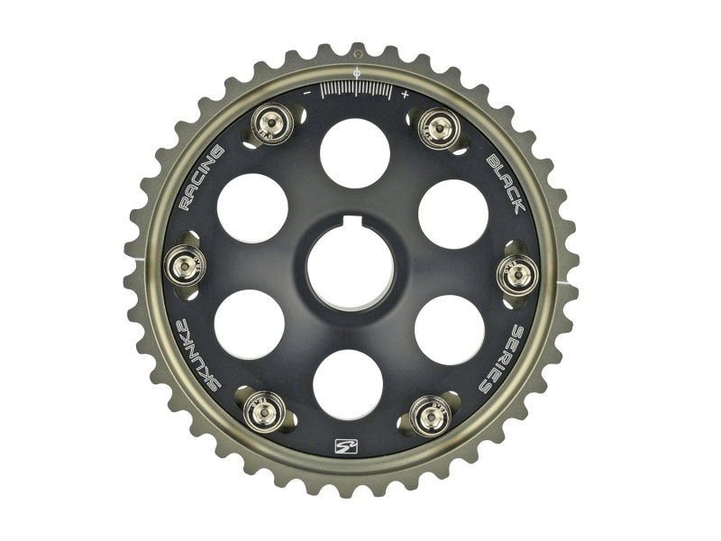 An engine's camshafts must be set at their proper positions relative to the crankshaft in order to maximize horsepower. Pro Series Cam Gears for Hondas H-series & F-Series VTEC engines enable serious tuners to optimize horsepower and torque by being able to adjust camshaft timing +/- 10 degrees, in one-degree increments, allowing them to tailor the power curve appropriately. Thanks to laser-etched timing and directional marks, precise camshaft adjustments can be made quickly and easily. Pro Series Cam Gears feature precision-machined, hard-anodized teeth to reduce premature wear with a signature, six-bolt design that eliminates gear slipping. Skunk2's lightweight design (35 percent lighter than OEM) and CNC-machined, 7075-T6 billet aluminum construction reduces rotational inertia, resulting in increased engine response and acceleration. Skunk2's adjustable cam gears have also been proven on race cars in the most extreme conditions for more than a decade.