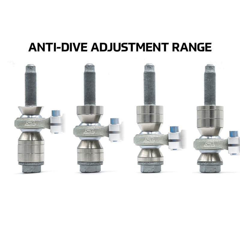 The SPL Front Lower Control Arm (FLCA) kit is the ultimate tool for setting up the front end of the GR86 / BRZ / GT86 / FR-S for track, drifting, or street use. Adjust track width, camber, caster, roll center, and anti-dive to increase front grip, gain tire clearance, greatly improve tire wear at the track, reduce body roll, and more, in addition to eliminating all of the bushing flex that causes vague and undesirable handling characteristics in corners and under braking.Camber AdjustmentOne of the biggest improvements to cornering grip you can make is increasing the front camber angle from the weak factory spec (0.0 to -0.75°) to a more proper -2.5° to -4.0° of front camber. This also will significantly improve tire life by reducing heavy wear on the outer portion of the tread that occurs due to insufficient camber angle while cornering. Elongating the lower arm will add more camber without the need for adjustable camber plates or eccentric bolts that could potentially slip. However, pairing the SPL LCAs with camber plates allows you more adjustability options for inner and outer tire clearance as well as elongating the track width while retaining a specific camber angle.Caster AdjustmentAnother important alignment spec is caster angle. Caster angle is particularly helpful on a McPherson strut suspension because it increases the amount of camber that is gained as steering angle is increased. It also improves the centering torque on the steering wheel for straight line stability. The OEM spec is a little over 5.0° which compared to other platforms is a bit on the low side. The SPL arms will allow most setups to run 7.0+° of caster, depending on wheel clearance. The result is better grip mid-corner.