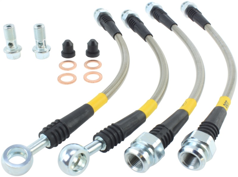 StopTech Stainless Steel Braided Brake Lines provide a quicker; firmer; more consistent pedal response by maintaining consistent brake pressure. Additionally; stainless steel lines provide precision brake modulation; especially during threshold braking. The improvement in pedal feel is more dramatic on older vehicles where the factory rubber line may have softened and swelled due to age. A variety of end fittings are available to meet application needs. All fittings are engineered for proper fit and durability. All necessary brackets and fasteners are included with each line kit.