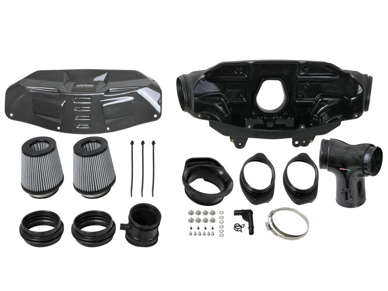 Dual 4” Flange 360-degree radial flow air filters feature our oil-free Pro DRY S media with three layers of synthetic media for maximum convenience. Their progressive layering provides great filtration efficiency and dust holding capacity, while not requiring the use of oils. This media is best suited for street use. Their inverted tops make for more filter surface area, resulting in longer service intervals. Lightweight twill weave carbon fiber tube directs the filtered air from the dual air filters to the engine. It is computer designed and dyno tested to increase air flow while reducing weight and enhancing the visual appearance of the engine bay. The tube is manufactured out of 100% carbon fiber material (No fiberglass). The dual air filters are surrounded by an open-element XLPE (cross-linked polyethylene) polymer housing that minimizes warm engine air for maximum performance. It is precisely designed and manufactured to fit perfectly into the factory mounting location. The housing connects to the factory air inlets on each side of the vehicle to capture the coolest air available. Silicone bellow couplings are used for engine movement and easy installation. This unique carbon fiber cover is also lightweight high gloss clear-coated twill weave carbon fiber and closes off the housing from unwanted hot engine air. It features a Black Series emblem for authenticity and is secured to the housing using aFe POWER laser etched washers and bolts. This cover will greatly enhance your engine bay appearance. Premium stainless steel clamps and flexible silicone couplings are used for strength and durability while also providing the most secure installation available.