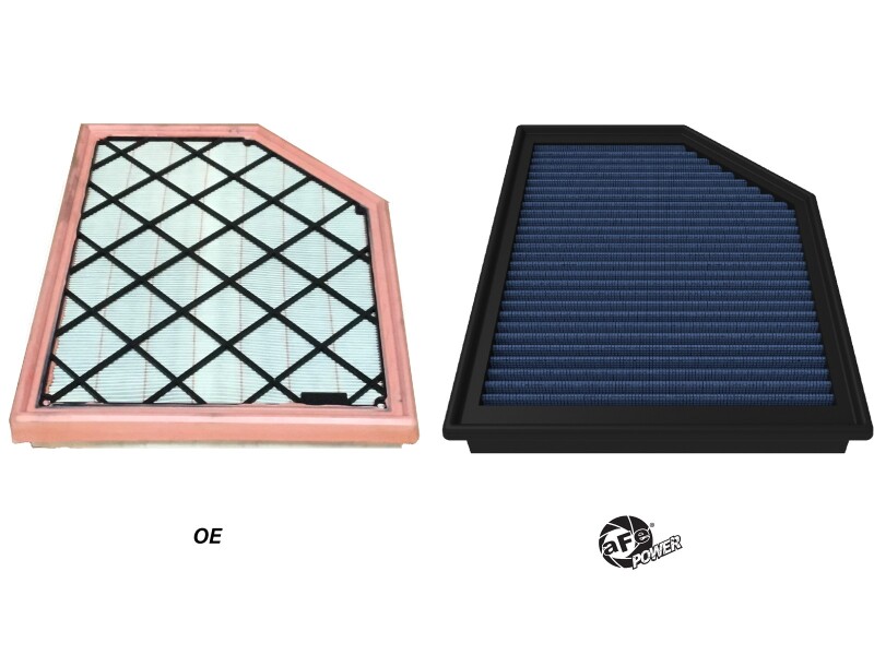 This filter features five layers of pre-oiled cotton gauze media to provide maximum performance. Its progressive layering allows the filter to flow at high levels even when dirty. This media is perfect for street and/or track use. Pro 5R filters are easily recharged with aFe's POWER CLEANER and blue air filter oil. aFe POWER performance air filters use a rounded, evenly spaced pleat design which allows for more usable filter surface area, providing increased flow and greater dust holding capacity. This pliable sealing surface conforms to even the most uneven filter housing, making for a perfect filter fit and sealing surface every time. This design eliminates the use of gaskets or sealants and always goes back to its original form. All aFe POWER flat panel performance air filters are constructed with a full 360-degree polyurethane frame. Unlike other materials that degrade after repeated heat cycles in an engine bay, polyurethane maintains its original molded shape.