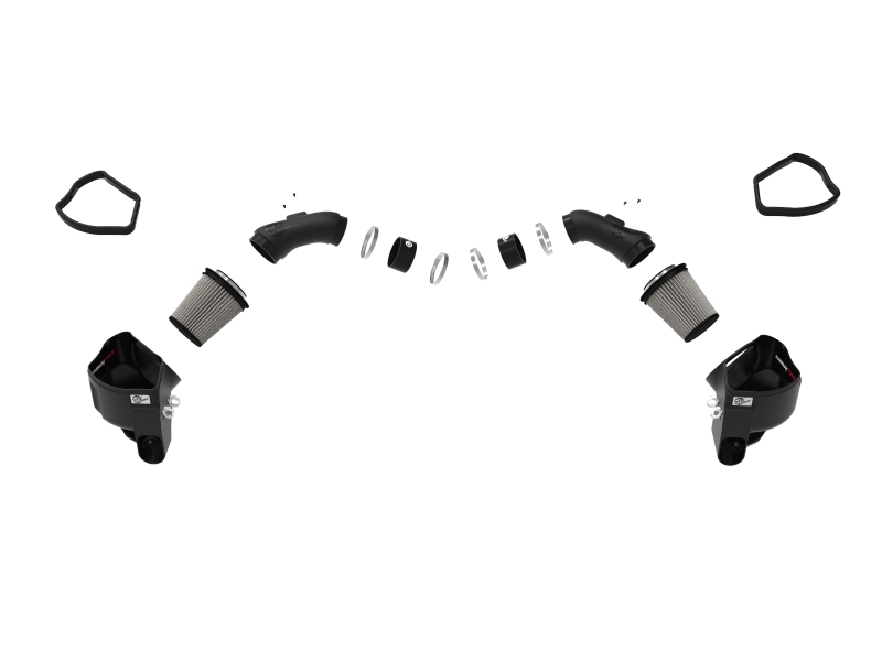 These 360-degree radial flow air filters feature a 4" flange and our oil-free Pro DRY S media with three layers of synthetic media for maximum convenience. Their progressive layering provides great filtration efficiency and dust holding capacity, while not requiring the use of oils. This media is best suited for street use. The included massive air filters are surrounded by open-element XLPE (cross-linked polyethylene) polymer housings that minimize warm engine air for maximum performance. Their open design allows for easy viewing of their air filters and delivers an aggressive Air Intake sound. In addition to the system's built-in air inlets, optional Dynamic Air Scoops (sold separately) are available to bring more cool air from the front of the vehicle into the intake housing (PN 54-12489-C).This system features high quality, computer-designed, dyno-tuned intake tubes to achieve maximum power gains while maintaining a perfect fit. Their XLPE material is heat soak resistant and extremely durable. This is a direct fit intake system that utilizes factory mounting points and requires no cutting or modifications. All necessary clamps, couplings, and hardware are included. Its revolutionary design, featuring our patent pending filter-to-housing interface, uses half the number of parts of a traditional cold air intake system.