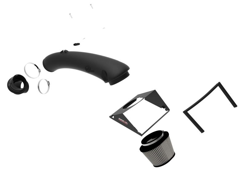 This 5-3/4” tall 360-degree radial flow air filter features a 5-1/2" flange and our oil-free Pro DRY S media with three layers of synthetic media for maximum convenience. Its progressive layering provides great filtration efficiency and dust holding capacity, while not requiring the use of oils. This media is best suited for street use. Its inverted top makes for more filter surface area, resulting in longer service intervals.aFe POWER developed this heat shield to snap onto the top of the lower half of the factory air box to provide a hassle-free installation utilizing factory mounting locations. This system features a high quality, computer-designed, dyno-tuned intake tube to achieve maximum power gains while maintaining a perfect fit. Its XLPE (cross-linked polyethylene) material is heat soak resistant and extremely durable. The computer designed system utilizes factory mounting locations, minimizing the use of unnecessary hardware, and ensuring a perfect fit every time. This is a direct bolt-on kit that requires no cutting or drilling on factory parts. Stainless-steel clamps are included for strength, and a premium silicone coupling allow for ample flexibility. This air intake system works perfectly in combination with aFe POWER D.A.S. (Dynamic Air Scoop): 52-10010S(Black), 52-10010SR(Red) and 52-10010SL(Blue).