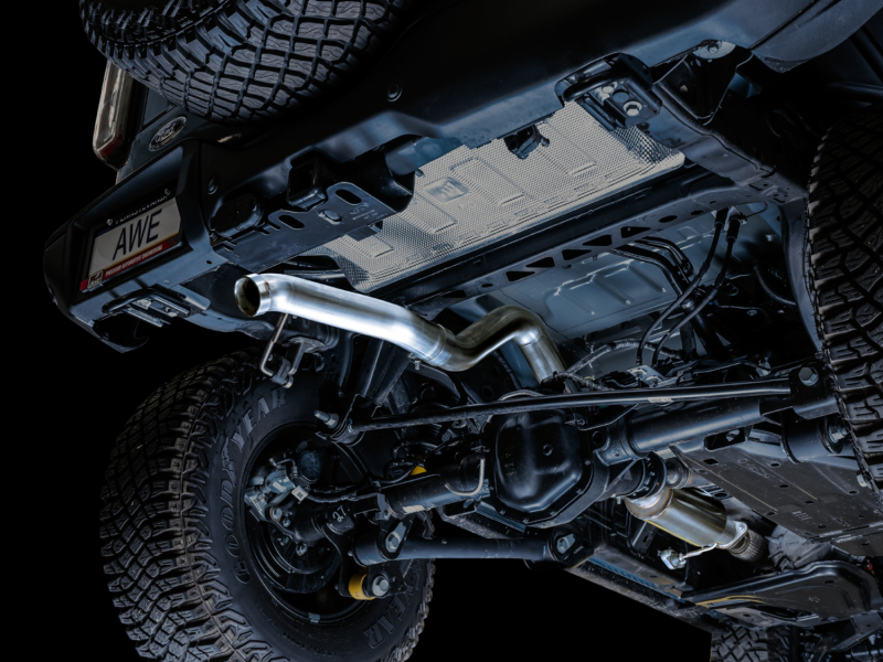 Handcrafted from US-made 3” T304L stainless steel, the 0FG Exhaust is a straight-through Cat Back configuration applicable to all Bronco models – 2.3T, 2.7TT, 2-door and 4-door – with modular capabilities unlike anything on the planet. The 0FG Exhaust features a bespoke AWE resonator in the mid pipe to produce an appropriate dose of aggression, followed by smooth bends towards the rear of the Bronco. On the way to the rear, depending on how many doors there are on your Bronco, lies an included adapter to bridge the difference in length across models. 2-door owner simply won't need these adapters, but 4-door owners will be thrilled. This system you're checking out is the version with only the AWE BashGuard™ - and no tips at all - made for those who know they'll never want to see those beautiful tips. All clearance all the time, hidden above the tow hooks, well out of harm's way. The high-tuck BashGuard™ is appropriately equipped with a .125” thick reinforced stainless ring. Perfect for bashin’. One exhaust. Every terrain. AWE's No CEL Guarantee, Perfect Fitment Guarantee, and Lifetime Warranty come standard.