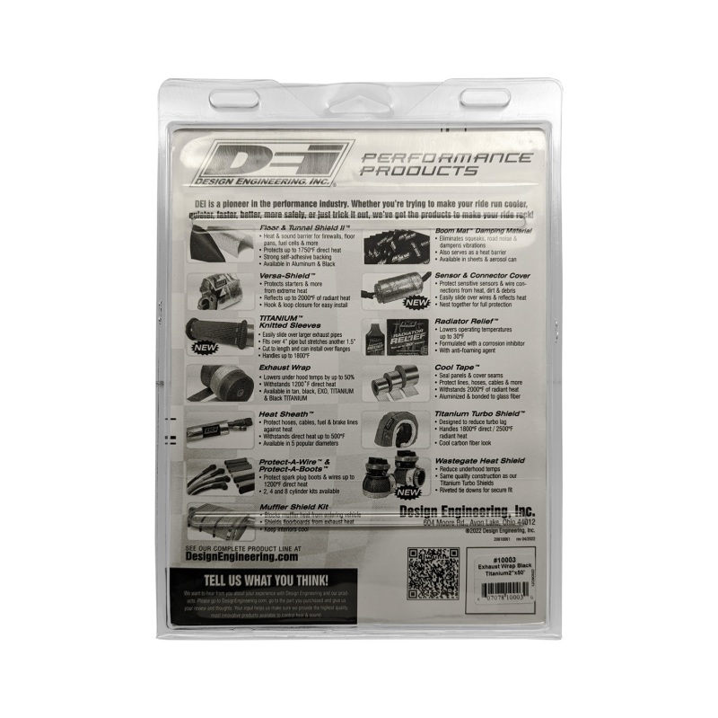 Black Titanium Exhaust Wrap, with LR Technology, is made from pulverized lava rock, stranded into a fiber material then woven into a proprietary weave. Black Titanium wrap is engineered to be stronger than most wraps and more durable for improved thermal performance and reliability. Designed to be pliable and resistant to chemical oil spills and vibration breakdown; it secures tightly without pre-wetting and is able to withstand direct heat up to 1800°F and intermittent heat up to 2500°F. Like the original Titanium Wrap, DEI's Black Titanium Wrap maximizes horsepower and performance by reducing underhood temperatures and maintaining high exhaust gas velocity. Wrapped headers and exhaust also reduces the incidence of heat soak, can prevent harmful burns, protect heat sensitive underhood components, and reduce the level of heat transmitted through the firewall and floor of the vehicle for a more comfortable interior. Black carbon fiber look Extremely pliable for a tight & secure wrap Withstands 1800?F direct / 2500?F intermittent heat Pre-wetting roll not necessary for wrapping Reduce underhood temps NOTE: Catalytic Convertors: Wrapping of the catalytic converter is not recommended, as overheating can lead to reduced lifetime of the converter. Instead, try our Corvette Catalytic Converter Shield or create your own shield using our Floor & Tunnel Shield II(TM). Removal: Exhaust wrap is not designed to be moved or removed after it has been heat cycled. After the fibers have been heated, they lose their initial flexibility. This does not reduce the thermal properties of the exhaust wrap. Be aware of this before you decide to remove the wrap. For this reason, you should avoid wrapping any flex-pipes or flex-joints.
