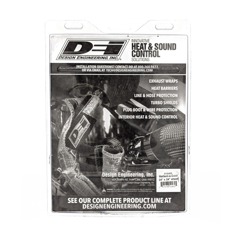 Reflect-A-Cool(TM) solves the problem of heat intrusion into interiors and components. Reflect-A-Cool(TM), constructed of fiberglass material backed with a layer of aluminized reflective foil to handle direct continuous temperature of 400°F has many uses such as covering firewalls, marine engine compartments, RVs, in the tub of a race car where typical mechanical fasteners cannot be used and has many industrial uses. Reflect-A-Cool(TM) can be trimmed to fit just about any shape. Just measure, trim, face reflective side towards source of radiant heat and remove self-adhesive backing. It's that easy. Protect wires, cables, hoses, pipes & tubing from radiant heat sources Radiant heat protection up to 2000°F Self-adhesive backing with release liner for easy installation Moisture & solvent resistant Virtually NO clearance needed Light weight and flexible-Trim to size 0.0065 in. thick Easy to apply, won't lift off *DO NOT apply directly to exhaust components.