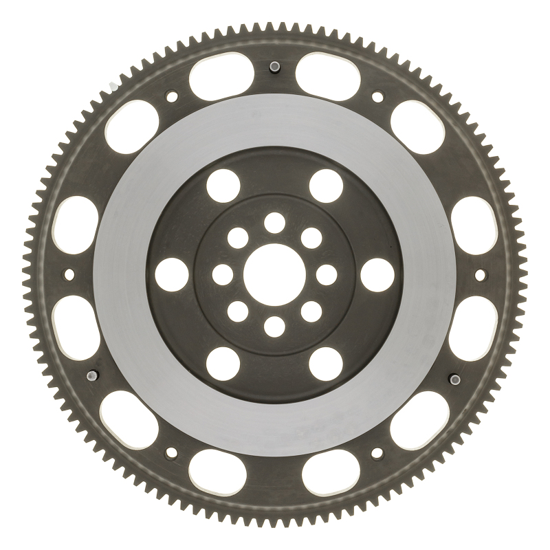 Exedy flywheels combine low weight, low inertia and high thermal capacity. They are designed for lightly tuned racing cars and drag racing, autocross and rally events, as well as street usage. They are made from solid one-piece billet chromoly steel or chromoly steel forgings. They are specifically designed to reduce weight and inertia for better engine response. Most incorporate special design features to enhance airflow and cooling of the clutch. The ring gear teeth are integrated onto the flywheel unlike an aluminum flywheel where the ring gear is pressed onto the flywheel and has the possibility of separating due to different expansion coefficients of aluminum vs. steel. Exedy steel billet and forged steel flywheels have passed engineering tests to 15,000-18,000 rpm and guaranteed not to fail to the said rpm and are all SFI approved.