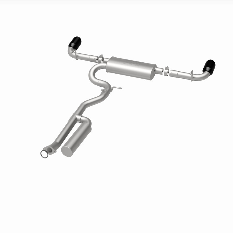 The MagnaFlow Toyota RAV4 Street Series Cat-Back Performance Exhaust System #19500 is designed to inject your 2019-2025 Toyota RAV4 2.5L (non-hybrid) with MagnaFlow’s deep signature exhaust note and dyno-proven performance. Each #19500 exhaust kit features a cat-back layout with 2.5” mandrel bent tubing leading through a straight-through muffler and on to 4” black chrome finished tips in a dual split rear exit configuration. Exhaust system #19500 utilizes a resonator that incorporates MagnaFlow’s No Drone Technology (NDT) to keep low-rpm noises in check while generating moderate exterior exhaust volume and maintaining comfortably mild interior sound levels. This RAV4 performance exhaust system is produced using CNC precision robotic manufacturing and features durable 100% stainless steel construction backed by MagnaFlow’s limited lifetime warranty.