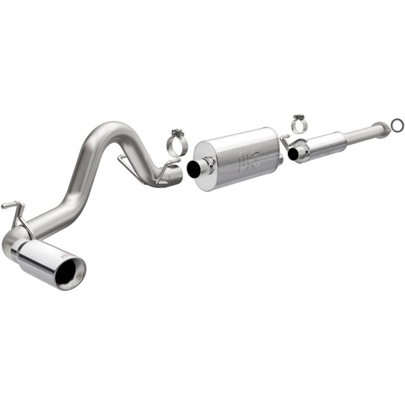 The MagnaFlow 2016-2023 Toyota Tacoma Street Series Cat-Back Performance Exhaust System 19275 brings out the personality of your 2.7L 2016-2023 Toyota Tacoma with our signature resonant, powerful engine tone and dyno-proven performance. Thanks to its fast-flowing, mandrel bent 3in. main piping and 2 Straight-Through mufflers ending in a Single Passenger Side Rear exit with 4in. Polished Welded-On Double Wall Angle Cut Rolled Edge tips, this Toyota Tacoma exhaust kit has the performance chops to match its sporty sound and appearance. Upgrade your ride to the next level with an exhaust that has the pipes to put other Toyota Tacoma's to shame. With this system your vehicle will be producing Moderate exterior and Mild interior sound levels while leaving other cars and trucks feeling envious at every stoplight. Exhaust kit 19275 features a cat-back layout that replaces your ride's stock exhaust components from near the catalytic converter on back. Extensive 3D scanning during development has resulted in a direct-fit design that you can easily install yourself. 19275 is produced using CNC precision robotic manufacturing techniques and is backed by MagnaFlow's 1-year limited finish warranty and limited lifetime construction warranty.