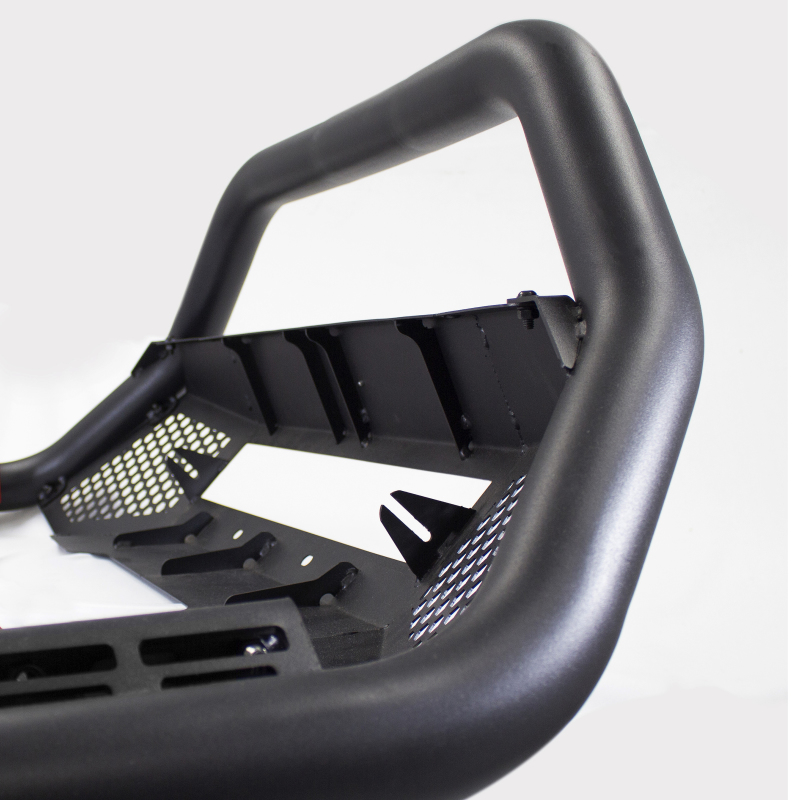 Go Rhino's RC4 LR Bull Bar is a modern, sportier take on classic truck front protection. The 2.5" diameter tubular steel frame features a steel skid plate with a stylish hexagonal cut out patter, a slot for a 20" single row LED light bar, and pre-drilled holes along the center crossmember for additional auxiliary lighting. RC4 LR Frame comes with a Limited Lifetime warranty on materials and construction and a 5 year warranty on the Textured Black Finish.