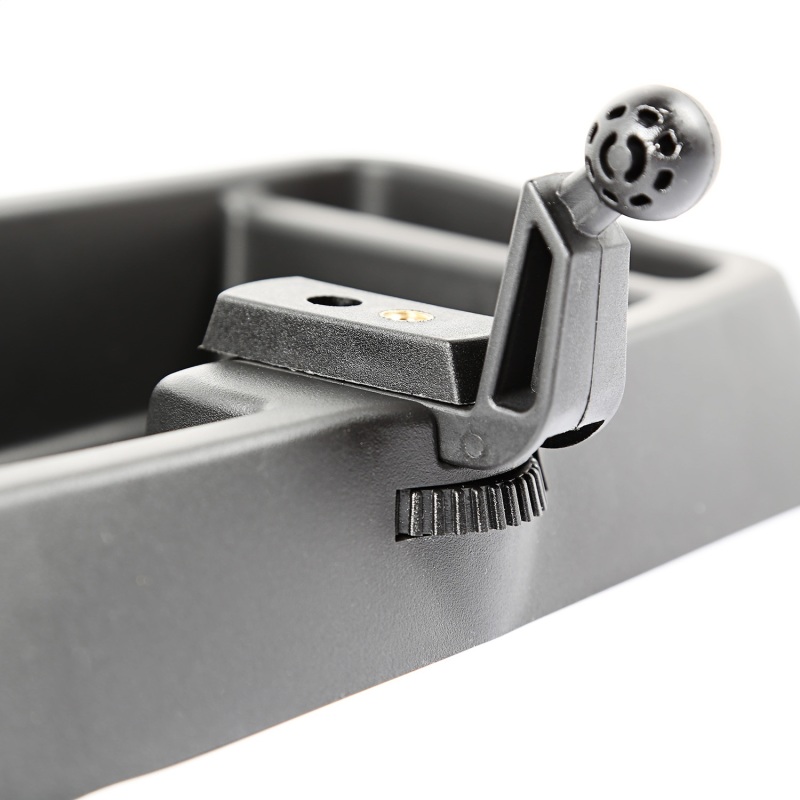 Never miss a moment of trail action again! This patented Rugged Ridge Dash Multi-Mount System is the most versatile dashboard accessory mounting system available. Featuring a universal ball mount for driver info gadgets and a tripod stud for point and shoots or POV cameras, this mounting system allows the driver to use either one individually or both at the same time! This new system includes a 2 section tray, which can be utilized to store coins, pens or sunglasses, and features both tripod and ball socket mounts to keep cell phones, GPS, cameras and even radar detectors within reach of both the passenger and driver. The form fitting design matches the exact contours of the factory Wrangler dashboard, and is secured with self-drilling screws. Patent No. 9,132,779 and 9,283,898