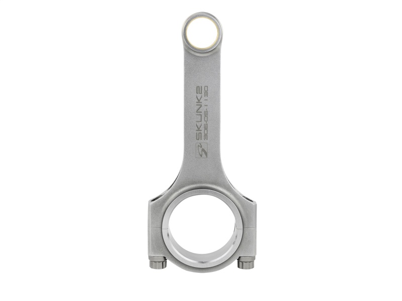 Alpha Series Rods are forged from select 4340 chromoly steel and feature an H-beam design, resulting in the ultimate strength-to-weight ratio. 4340 chromoly is one of the strongest materials available, however, not all 4340 chromoly is the same. As such, Skunk2 relies on extensive material testing and works closely with its foundry to produce high-quality rods at an affordable price. Comprehensive heat-treating, tempering, and shot-peening processes together ensure that each Alpha Series Rod remains consistent and strong. Finally, each rod is magna-fluxed to ensure integrity and that each process has been completed thoroughly and according to Skunk2's rigid specifications. Skunk2's engineers spent nearly three years developing and testing its H-beam rod design. The results are one of the strongest beam configurations available, capable of handling more than 900 hp. Engineers made use of FEA (Finite Element Analysis) to determine high-stress points and implemented features to reduce wear and increase strength. Skunk2's straight design distributes stress across a larger area when compared to tapered rods, providing additional support where necessary. Alpha Series Rods are manufactured from two-piece forgings, resulting in optimal grain orientation along the rod cap for increased strength. By orienting the metal's grain in the direction of stress along the rod cap, perpendicular to the stress exerted along the beam, strength is significantly increased. Skunk2's two-piece forgings provide a precision-tight fit between the rod's cap and its beam without resorting to the brittle materials required by other processes. Alpha Series Rods also feature dual oil passages at their pin ends, providing additional lubrication and cooling, which leads to an even stronger, more durable rod. Unlike other designs, Skunk2's carefully positioned, offset oil passages help deliver lubrication around the entire wrist pin, during each phase of the engine cycle.