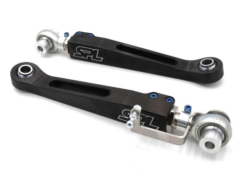 BMW F2X/F3X Front Lower Control Arms (FLCA) provide roll center, camber, and track width adjustment for the BMW F2X/F3X, and allow for full articulation with the proper ball joint angle. The main arm is slotted to allow the use of pinch bolts, and our rotating clamps on SPL Parts' exclusive Double Adjuster lock down camber and track width settings. No more jam nuts!! Long gone are the days of fumbling with multiple wrenches to tighten jam nuts in place while trying to keep your bearings oriented correctly. Our Double Adjuster is machined from 4130 Chromoly, gun drilled to reduce weight, then electroless nickel plated for corrosion resistance. Blue Anodized Titanium hardware shaves even more unsprung weight from the arms without compromising strength. Stainless Steel spacers are provided to correct roll center for lowered vehicles