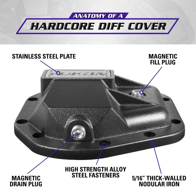 Yukon Hardcore Diff Covers are constructed from thick-walled, high-strength nodular steel to protect lockers, gears and axles from the most extreme hits in off road driving. They also increase the structural rigidity of the differential, reducing deflection under high-torque situations that can put severe loads on vital internal parts. Yukon Hardcore Diff Covers feature a durable powder coat finish and high strength steel fasteners for easy bolt-on installation. It’s no secret that the underside of your rig can take a beating. Remember your diff! It’s the lowest hanging fruit and very susceptible to damage… crack or break it and you’re done for the day. Upgrade to a Yukon Hardcore Diff Cover and enjoy more peace of mind on the trail.